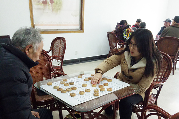 图为教科志愿者在南京市社区敬老院陪空巢老人下象棋。记者 薛莹洁 摄