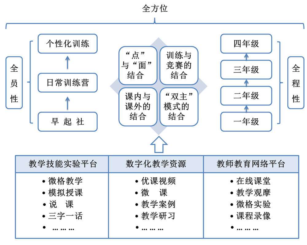 此外,该校还构建了“三能四习”一体化的教师教育实践课程体系。“三能”指教师通用技能、教师专业技能和实践创新能力等三个方面能力培养课程,“四习”指演习、见习、实习、研习四个循序渐进的教育实践环节。不仅设立专门的集中实践环节,还加强部分理论课程的实践化改造。