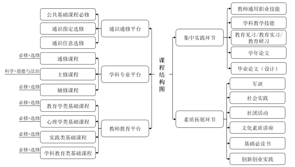指向于多科多能型卓越小学教师的培养,该校小学教育专业整体架构课程,以“大平台+小模块”为课程结构的基本特征,构建“跨学科、厚基础、重选择、强实践、国际化”的课程体系,涵养富有特色的课程文化。